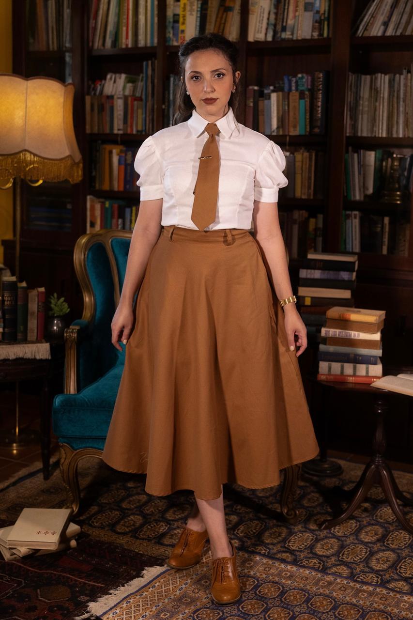 - Saia meio godê, trazendo aquele toque vintage dos anos 40 que tanto amamos.